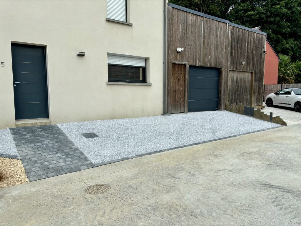 Nouvel aménagement.Allée en pavage.Création d’un massif pour embellir l’entrée.Le restant en nidagravel avec un joli gravier gris clair.