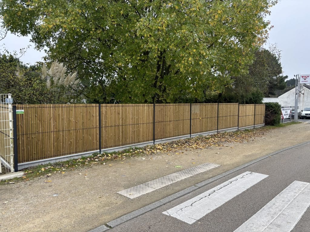A la suite de la pose d’une clôture grillagée équipée de lames occultantes en bois, le terrain est désormaisclairement délimité tout en offrant une meilleure intimité. Les lames en bois apportent une touchenaturelle et chaleureuse, transformant la clôture en un véritable élément esthétique, aussi fonctionnelqu’élégant.