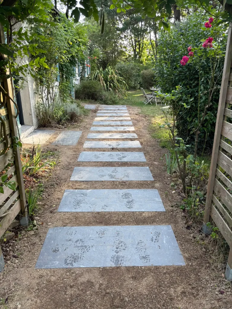 Suite à la création d’un chemin en dalles d’ardoise, la circulation dans le jardin est désormais plusconfortable et structurée. Ce chemin apporte une touche élégante et naturelle, tout en mettant en valeurles espaces extérieurs. Un aménagement à la fois pratique et esthétique, qui guide le pas avec style.