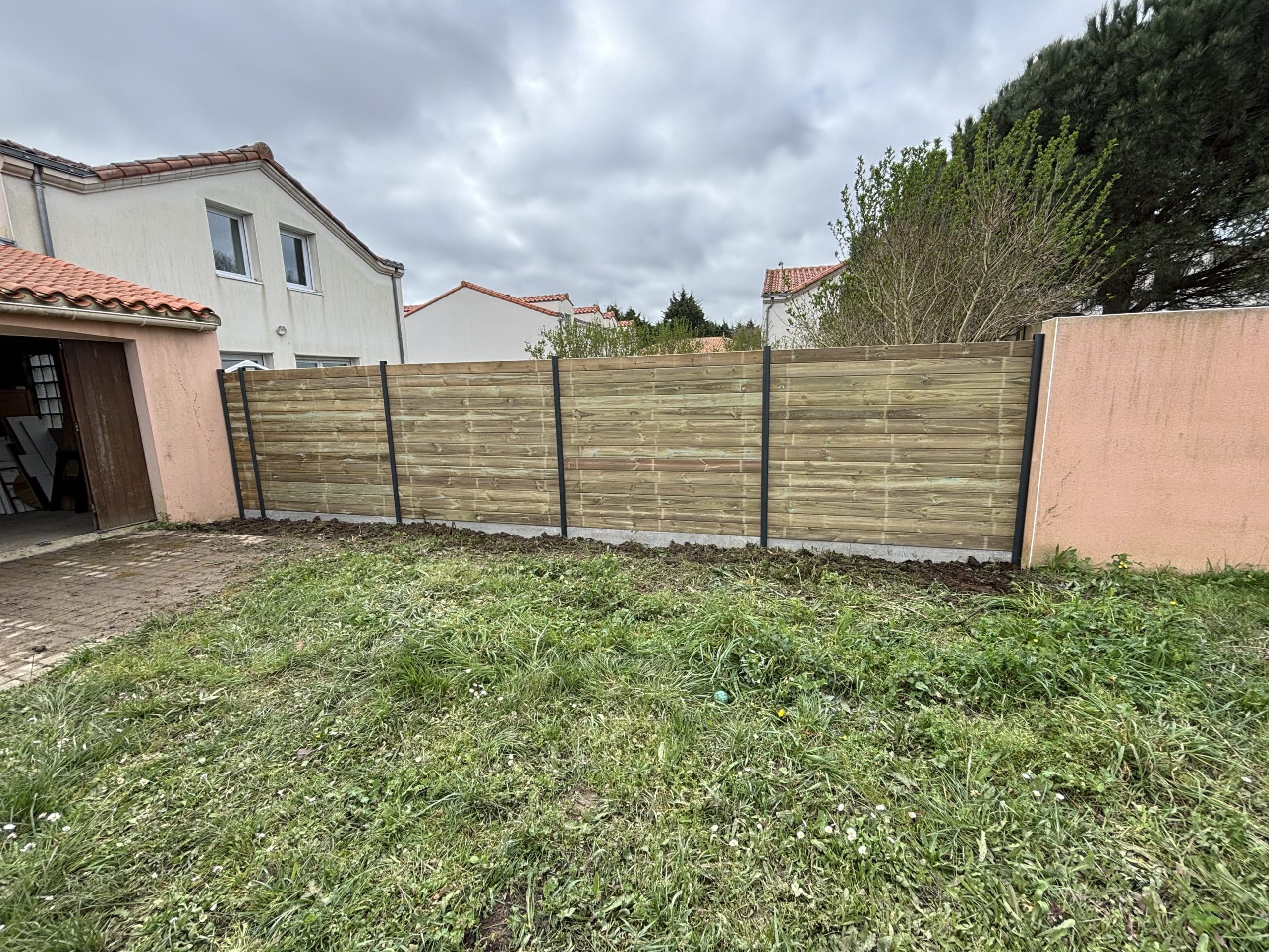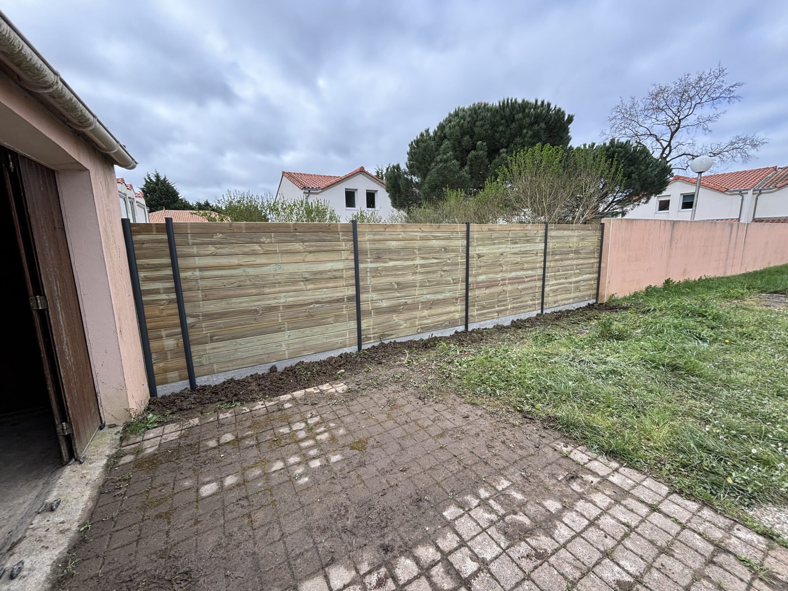 À la suite de la réalisation d’une clôture composée de poteaux en aluminium et de lames en bois, l’espace